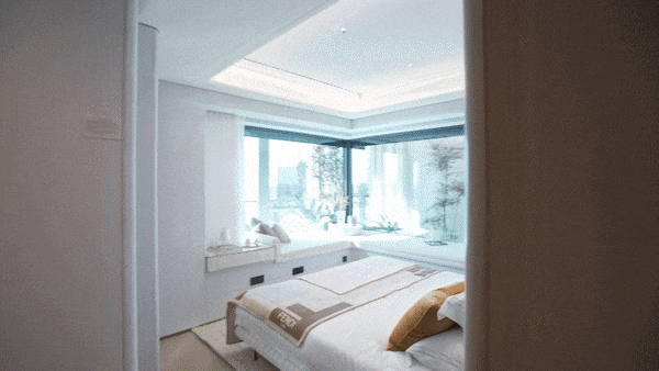 项目的灵动空间也非常丰富,除了大尺度阳台,主次卧配置大飘窗,阳台可以并入房间内,飘窗均为非承重结构,后期同样可砸,灵动空间拓展后整体的尺度感足以媲美以往150㎡的户型。