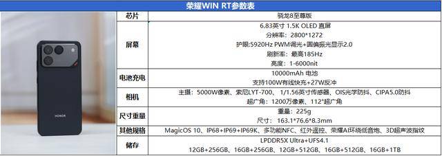 10000mAh电池、185Hz电竞屏、骁龙8至尊版、东风涡轮主动散热系统,和顶配版机型几乎完全一样的配置,但荣耀WIN RT的起售价仅为2699元(12GB+256GB)。