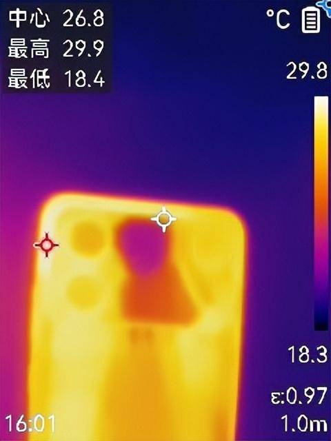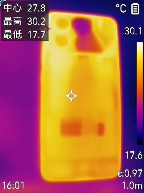 机身的最高温度为30度,在相机Deco的部分可以很容易地看到风扇带起来的低温区以及一条明显的温度风道从Deco底部吹出带出的一条高温带。