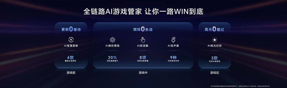荣耀WIN系列拥有全链路AI游戏管家,带来“AI智慧更新”“AI操控增强”“AI防误触”“AI变声器”“AI高光时刻”等功能,更新0等待、微操0失误、高光0错过,全面提升玩家的电竞体验,一路“WIN”到底。