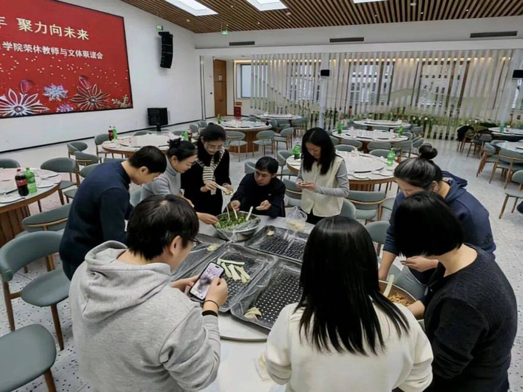 另一边的包饺子活动更是暖意融融。教工们挽起衣袖,分工协作,忙得不亦乐乎。形态各异的饺子在大家的手中诞生,有的圆润饱满,有的精巧别致,每一个饺子都包裹着对新年的期盼与对学院的热爱。当热气腾腾的饺子端上桌,大家围坐在一起品尝美食,畅谈未来,浓浓的年味与师生情在活动室里弥漫。